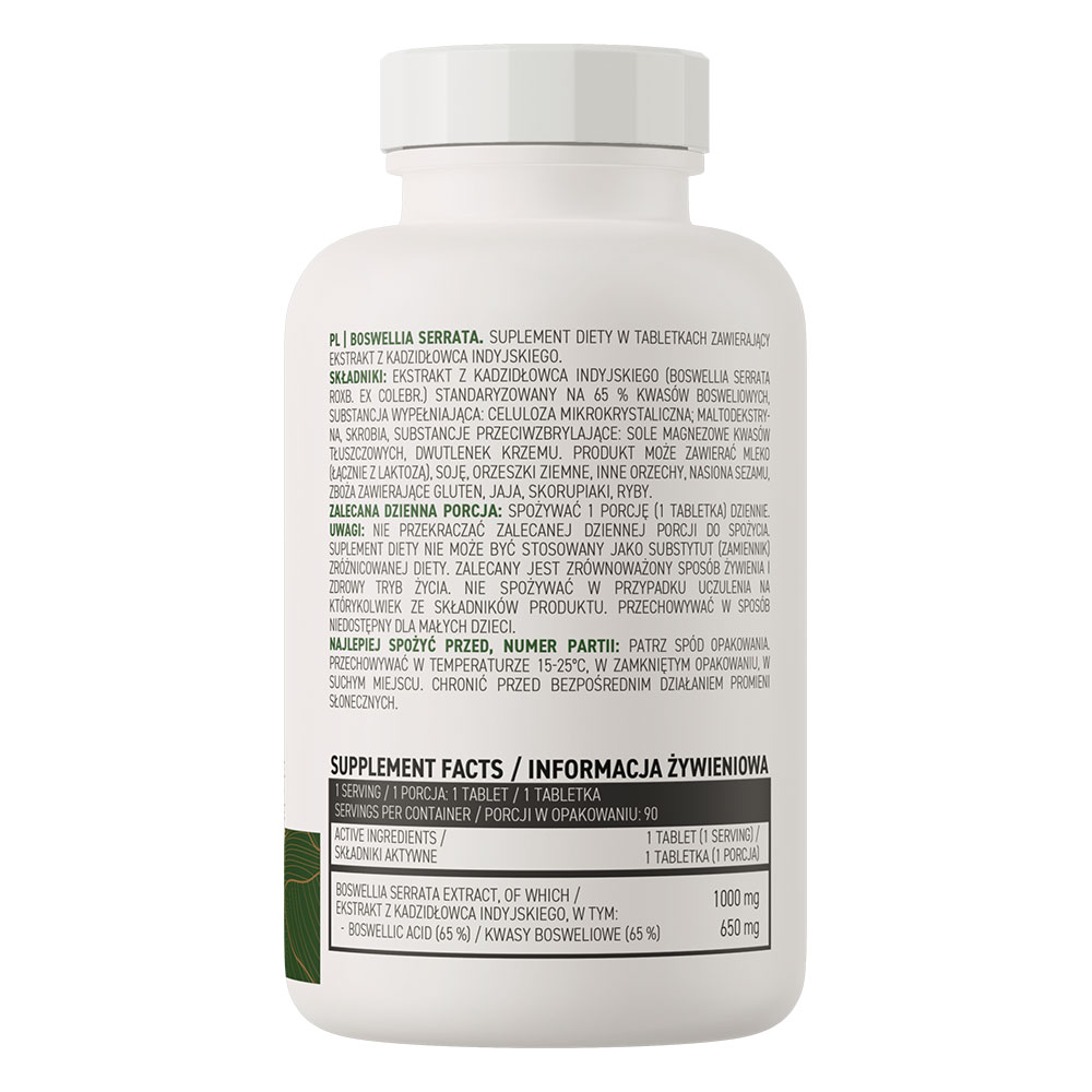 Boswellia extrakt 1000mg 90-tabletter är ett kosttillskott som anses främja normal funktion i leder.