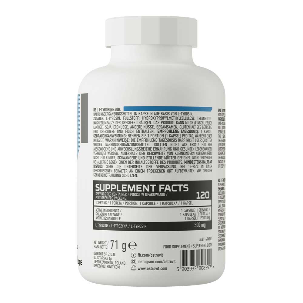 Tyrosin 500 120-kapslar är ett högkvalitativt kosttillskott. Tyrosin är en icke essentiell aminosyra och återfinns naturligt i många proteinrika livsmedel, såsom fisk, kött, kyckling, kalkon och soja.