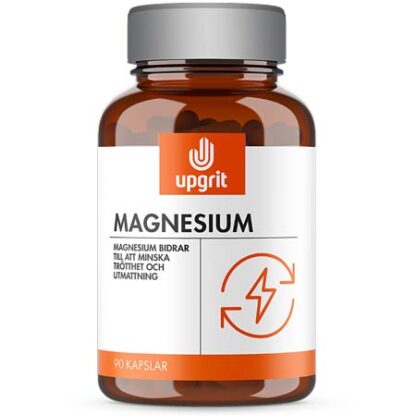 Upgrit Magnesium 90 kapslar är ett kosttillskott som innehåller 100% magnesiumbisglycinat. Magnesium är nödvändigt för en rad olika funktioner i kroppen. Magnesium bidrar till att minska trötthet och utmattning, elektrolytbalansen, normal energiomsättning, nervsystemets normala funktion, normal muskelfunktion, normal proteinsyntes, normal psykologisk funktion, bibehålla normal benstomme, bibehålla normala tänder och har en roll i celldelningsprocessen.